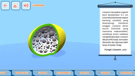 Aplikasi ini berisi materi Struktur dan Fungsi sel biologi. Bentuk Sel ditampilkan secara 3 Dimensi sehingga lebih mudah untuk dipahami dan juga menjadi lebih menarik. Terdapat juga penjelasan dengan suara sehingga lebih memudahkan dalam belajar.