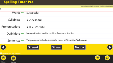 The main benefit of using Spelling Tutor Pro is patience. If you child needs to hear the word spoken a hundred times, no problem, just press the button to listen. You can also slow down the speed of the spoken word to hear each syllable.
