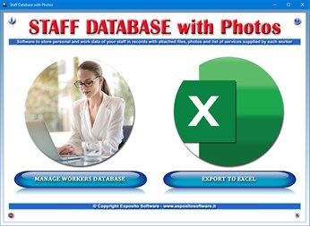 Staff Database with Photos is software designed to store the personal data of employees of organizations or companies of any kind, acquiring their photos with a webcam or importing them in Jpeg format. It is also possible to keep track of all of the services supplied by each individual worker. A special app allows you to export the staff database to a Microsoft Excel file, so that you can share the data with people who do not have Staff Database with Photos installed on their computers.
