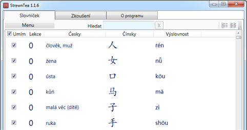 Součástí je moje databáze 11 lekcí cca 450 slovíček asi 350 znaků.