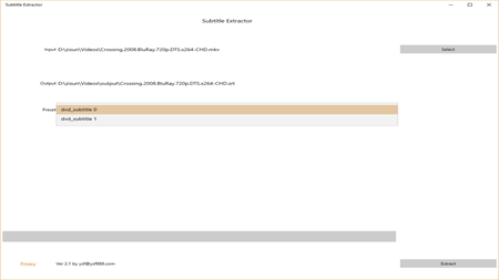 Subtitles Extractor enables you read or extract embedded subtitle tracks ASS (Advanced SSA) subtitle, DVB subtitles, DVB teletext, DVD subtitles, EIA-608 closed captions, HDMV Presentation Graphic Stream subtitles, HDMV Text subtitle, JACOsub subtitle, MicroDVD subtitle, MOV text, MPL2 subtitle, PJS (Phoenix Japanimation Society) subtitle, RealText subtitle, SAMI subtitle, SubRip subtitle with embedded timing, SSA (SubStation Alpha) subtitle, Spruce subtitle format, SubRip subtitle, SubViewer subtitle, SubViewer v1 subtitle, raw UTF-8 text, VPlayer subtitle, WebVTT subtitle and XSUB to SubRip subtitle(SRT) from MKV, AVI and MP4 video files. Support most popular subtitle formats. Now you can edit subtitle wherever and whenever. Simple settings, high speed, and friendly interface. It is very easy to use without any special setting, only a few clicks complete the task of extract subtitle; It can detect your hardware configuration and decide an optimized extract scheme automatically; Provide greater than 300% extracting speed by multithreading, so fast beyond your imagination.