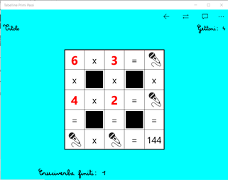 Tabelline Primi Passi aiuta gli alunni di scuola primaria a memorizzare la tavola della moltiplicazione. Comprende sette tipi di attività o giochi: tabelline dritte, tabelline rovesciate, tabelline incrociate, tabelline sottosopra, tiro a segno, radio tabelline, guado del torrente. Con due livelli di difficoltà: tabelline dal 2 al 5, tabelline dal 6 al 9. Al termine di ogni esercizio, il bambino o la bambina ottengono dei 'gettoni' con i quali possono 'ritirare' dei premi a sorpresa. L'applicazione non richiede l'uso della tastiera: le risposte esatte devono essere cliccate o devono essere dette al computer o al tablet. Quando è richiesta la risposta a voce, il bambino o la bambina devono parlare davanti al computer o al tablet, ad alta voce e in modo chiaro.