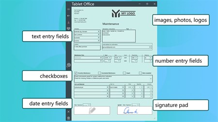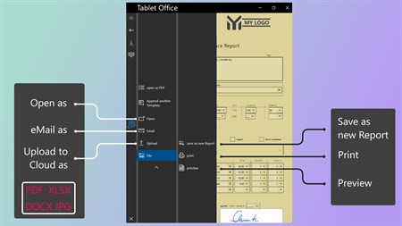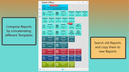 A Tablet Office felhasználó által meghatározott interaktív sablonokat használ az ismétlődő jelentésekhez és protokollokhoz. Támogatja többek között a szállítóleveleket, karbantartási jelentéseket, állapotjelentéseket, naplókat, hibajelentéseket, egyszerű megjegyzéseket. Hasznos adatgyűjtéshez és az együttműködőkkel való megosztáshoz és archiváláshoz is. A jelentések összeállíthatók különböző sablonok összefűzésével.