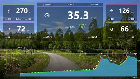 While you see the route going by on your screen at your own speed, the trainer’s resistance is adjusted to the grade in the video. The trainer sends your power, speed and cadence to the device where it is displayed clearly on your screen. Afterwards you can analyze your data to keep track of your performance and you can upload your training data to Strava.