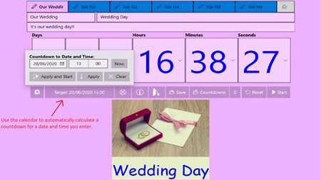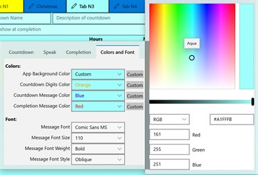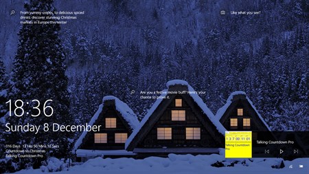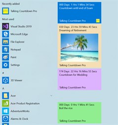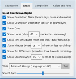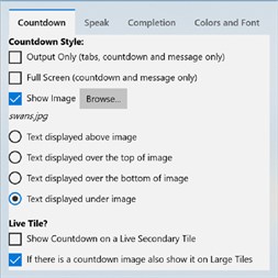 As well as text and speech, countdowns can be accompanied with images, configurable text fonts, colors, completion messages spoken and visual, alarm melodies, flashing text, pop-up 'toasts', audio/music recordings, live tile and lock screen updates.