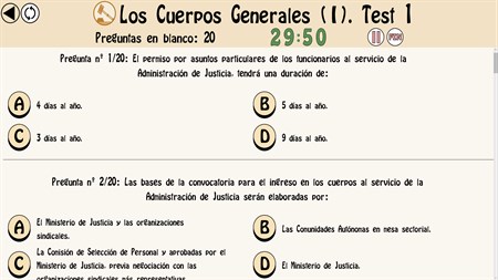 - Más de 450 Test. - 9.000 Preguntas. - 17 exámenes oficiales. - Contiene temas como: Constitución, Derechos humanos, Unión europea, Tribunal supremo, Juzgados de primera instancia, Administración de Justicia, Cuerpos generales, libertad sindical, Ley de Enjuiciamiento Civil, Proceso labora, Registro civil... - Simulación de examen. - Actualizaciones periódicas de las preguntas. - Dos modos de realizar un mismo test (modo de respuesta instantánea o modo examen). - Estadísticas de los test realizados.