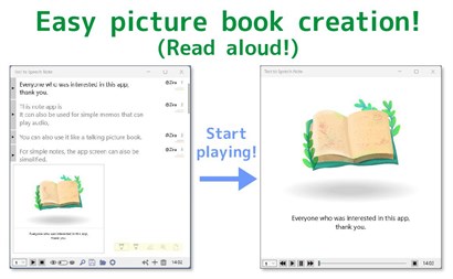 Let's make a read aloud picture book! You can make various things with picture books, manga, manuals, and ideas! -------------------------------------------------------------------- Text to Speech Note Web Page https://nekopom.jp/us_Text_to_Speech_Note_Home.html Support destination : nekopom@nekopom.jp ---------------------------------------------------------------------------- *Please use the trial version to check whether it works in your environment before purchasing. *The trial version does not allow you to save data or move pages during playback. ---------------------------------------------------------------------------- Please. If you have any problems with the app, please contact nekopom. I will do my best to deal with it, so please contact me first.