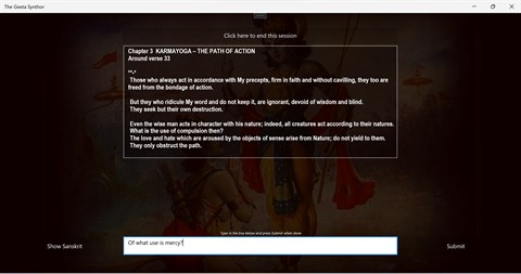 The Geeta shapes the beliefs and attitudes of billions of people, but are seldom read. The references come from another person, who heard it from another person....like in a Chinese Whisper. This Synthor can tell you what is actually written in these ancient and timeless texts.