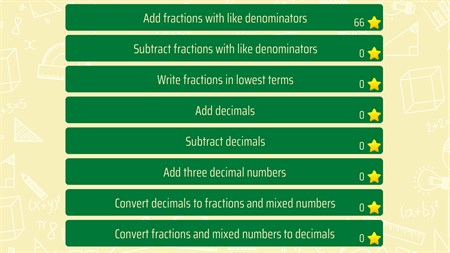 With Third grade Math skills - Fractions and Decimals you can practice and improve the following math skills: - Add fractions with like denominators - Subtract fractions with like denominators - Write fractions in lowest terms - Add decimal numbers - Subtract decimal numbers - Add three decimal numbers - Convert decimals to fractions and mixed numbers - Convert fractions and mixed numbers to decimals