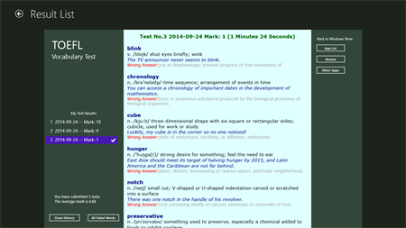 What are special features of TOEFL Vocabulary Test? It offers great features TOEFL words builders are interested. You can know mark and time consuming of each test, and review previous test results and failed words.