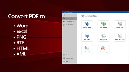 Total PDF Converter is an all-in-one PDF conversion product suite that allows users to convert PDF files to a variety of formats, including Word, Excel, RTF, HTML, XML, Text, and various image formats. Additionally, the app supports conversion to PDF from other file formats such as Word, Excel, PowerPoint, and images.