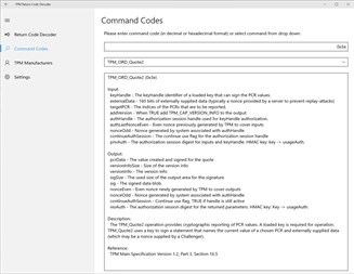 The TPM Return Code Decoder allows to decode error codes returned by or look up commands available on Trusted Platform Modules (TPM) of version 1.2 and 2.0.