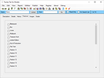 Tracker Ten for Models is a complete windows inventory system that will help you get you organized fast. It is ideal for tracking all types of models, including planes, ships, boats, cars and more. The software features advanced reporting, graph generation, item history tracking, customizable data fields, rich text format notes, data export, a powerful search engine, cost and value tracking (based on values you enter yourself) and multi file support. The software can also generate full color reports, incorporating images; great for accurate insurance record keeping and automatic catalog generation. The software is ideal for both business and personal use.