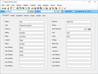 Tracker Ten for Wine is a full featured database system that keeps track of your wine collection. It features a powerful search engine, a versatile report writer, easy data entry, barcode generation and scanning, context sensitive help, full customization, data graphing, multiple image support and much more. The software is very easy to use.