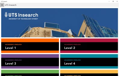 UTS Insearch are world leaders in English language learning and offer the most advanced academic English curriculum on the market. Developed by a highly qualified and experienced English language curriculum team, this A$2.5million curriculum was purpose-built to set students up for success, at university and in the global workplace. This app provides UTS Insearch Academic English students access to digital versions of their course materials. Free access to this app is available to all students studying UTS Insearch Academic English at our Sydney campus or at our partner institutions: • ACET in Vietnam • EIC in China • IEN in South Korea • UIG in Indonesia • AEC in Myanmar • NLICC in Nepal