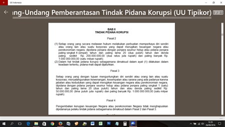 Dalam Aplikasi UU Indonesia terdapat beberapa Undang-undang dan atau kitab perundang-undangan yang bisa di dapatkan sebagai bahan pembelajaran seputar hukum yang berlaku di Indonesia, dan yang bisa diakses dengan mudah dan praktis melalui tablet dan komputer berbasis Windows 8. Beberapa Undang-Undang tersebut diantaranya adalah, KUHP, KUHPerdata, KUHAP, UU TIPIKOR, Peraturan Pajak, Undang-undang Perseroan Terbatas dan masih banyak lagi.