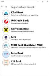 A ViCA alkalmazást jelenleg az alábbi pénzintézeti szolgáltatásokhoz lehet igénybe venni: - K&H Bank Electra rendszere - UniCredit Bank Spectra rendszere - Raiffeisen Bank Electra rendszere - Commerzbank Archív Electra rendszere - Giro Electra rendszere - MBH Bank (korábban MKB) Direct Bank / Vállalati Netbank - Erste Bank Electra és Vállalati NetBank rendszere - CIB Bank CIB Business Online rendszere