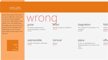 One of the most effective ways to expand your vocabulary, especially to prepare for standardized tests like the SAT or the GRE, is to simply learn these words rote. Using the unique features only found in Windows 8, such as semantic zoom, Vocabularist helps you learn new words by presenting them 10 at a time, and as and when you remember the correct definition, you will be presented with more new words!