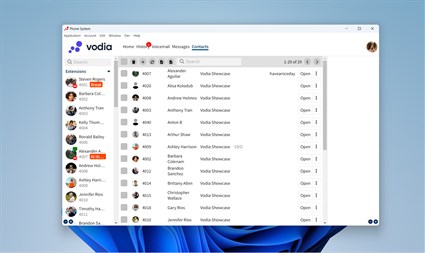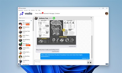 The Microsoft Windows client is a standalone version of the user front end. It runs the web front end as an application, so that it can be automatically started after logging in and continues running while the user is logged in. Because it is based on the web front end, it comes with all the features of the front end. This includes making and receiving phone calls, putting calls on hold and transferring calls. This makes it ideal as an application for front desk and call center agents that have to deal with a lot of calls during the day. Especially when using a good headset, voice quality can be as good or even better compared to a desktop phone. The Windows app is the best choice for texting. Vodia Phone to Vodia Phone calls are free. Operator data charges may apply. We recommend using an unlimited data plan or WiFi connection. Commercial features of this app require a paid subscription or a trial 60-day subscription. If you’re not sure about your company’s subscription or the services you have access to, visit https://vodia.com to learn more or contact your IT department.