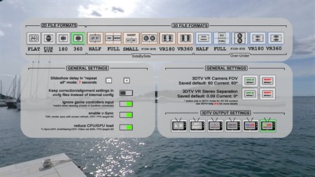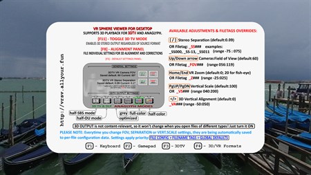 - Playback of spherical (equirectangular) 180°/360° 2D and 3D videos and pictures WITHOUT VR HEADSET as a 2D desktop experience or a 3D experience with 3D TV or 3D DLP projector or even a fun with your old "anaglyph" glasses. Since version 1.1.40 also fish-eye 2D/3D 180 OU/SBS is supported. - Viewing of 2D and 3D "Flat" pictures like a regular viewer - super-simple navigation with keyboard, mouse, touch and/or gamepad - spherical pictures horizon corrections - video playback speed control - file format auto-detection (by file name) - a quick and simple file picker (also controlled with gamepad thumbsticks) - intuitive keyboard and gamepad button mappings (help embedded in the app) and a lot more...