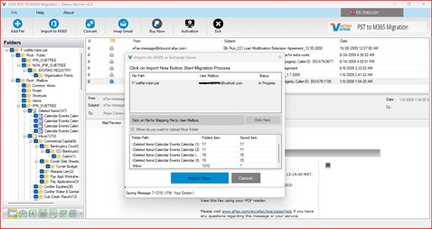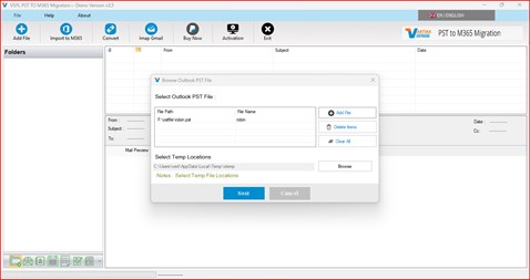 Outlook PST File is a Microsoft Outlook file format used for Store mailbox data such as emails, address books, calendars, notes, and tasks etc on a local computer as *.PST File. VSPL PST to M365 Migration tool to Migrate You Outlook PST file into Microsoft 365, Office 365, and Live Exchange Server. Its Migrate Outlook Mailbox Email, Contact, Appointment and Task etc. Tools Supported Outlook Store Version - 2021, 2019, 2016, 2013, 2010, 2007, 2003 Unicode and ANSI PST File. VSPL PST to M365 Migration Tool helps you import Exchange and Microsoft 365 Mailboxes folder such as - inboxes, contacts, and calendar contents to PST files. This free tool helps you easily import PST files to new Microsoft 365 mailboxes 30 Items each selected folders. VSPL PST to M365 Migration Tool help to users easily Outlook(*.PST) File & importing or migrate PST File Messages into Gmail, Yahoo! Mail, Others Any IMAP Supported Email Account, Its supported Office 365, Microsoft 365 and Live Exchange Server. Limitation: Demo version enables you to show preview of email and saved 30 messages each selected folder License Key Delivery: 15 Min to 24 hours may be taking license key delivery information send to your email address. If you are purchase from Microsoft store then send purchase receipt to support email address. support team send you license details to your purchase email address.