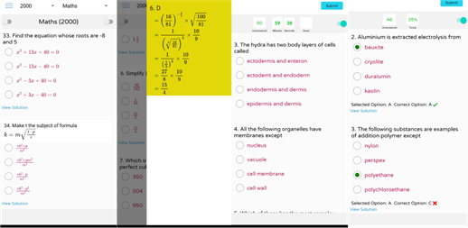 1. Enables users to study at their own pace with suitable solutions and clean User Interface and good user experience. 2. This apps offers the user the freedom to study in three different modes. i. Relaxed Mode: This is default mode. The student studies and can answer the questions freely. The app notifies the user when he makes the correct or wrong choice. ii. Correct Answers Mode: For fast revision study, the user can select this mode and scan through only correct answers. iii. CBT Mode: The user can chose to examine himself/herself under with stipulated to access his level of preparation.