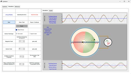The cyclotron is a device that can accelerate sub-atomic particles to a very high speed for particle experiments and clinical needs. It energizes particles, sending them through an alternating electric and a constant magnetic field. The cyclotron was invented by E. O. Lawrence and others. This app demonstrates the working of the cyclotron based on the Lawrence force equation. A set of graphs helps to investigate the concepts further. Users can change the variables in the equation and study the behavior. An excellent tool for physics students and teachers. A Windows 11 desktop application.