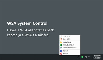 Egy egyszerű Tálca-alkalmazás, amely lehetővé teszi a Windows Subsystem for Android állapotának figyelését, valamint az alrendszer elindítását/leállítását. Elindíthatja a WSA Beállítások, az Android Beállítások és a Fájlok alkalmazást a jobb gombbal kattintva.