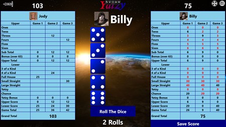 One or Two Players Choice of Over Ten Custom Backgrounds Choose From Seven Dice Colors Custom Yatzy Leader Boards Strategies Change With Every Roll Compete For High Scores With Online Players