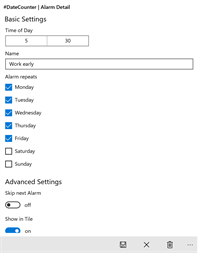 Features: - Unlimited amount of advanced alarms and counters - Alarm announcement prior to the alarm event - Alarm announcement enables you to dismiss the upcoming alarm event - Skip the next alarm event - Enable / disable alarms - Enable / disable snooze function for each alarm - Predefine the snooze duration for each alarm - Calculate the time (in a predefined intervall) since or up to an event - Live-Tiles showing upcoming alarms and calculated durations - Change the user interface language - Change 12 / 24 clock time - Change the user interface theme