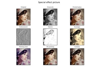 9pics app can generate a 9-in-1 picture including 8 different special effect pictures (Grayscale, Frosted glass, Embossment, Sketch, Nostalgia, Fleeting time, Oil painting, Cartoon) from an original picture. (1) Click the "OPEN ORIGINAL PICTURE FILE" button to select a original picture. (2) Click the "SELECT FOLDER TO SAVE SPECIAL EFFECT PICTURE" button to select a folder where the special effect picture is saved and start the conversion. When the conversion is completed, a "Convert to 9-in-1 special effect picture successfully!" dialog box will pop up, displaying "The filename of 9-in-1 picture will be automatically detected to avoid overwriting, and parentheses and a serial number will be added after the original filename, starting from (1), followed by (2), (3), (4), ...".