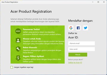 Registrasi Produk Acer membantu Anda untuk mendaftarkan perangkat Acer Anda dan mendapatkan berbagai keuntungan dan layanan eksklusif dengan Acer ID.