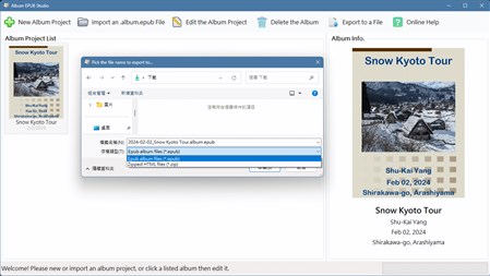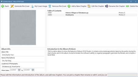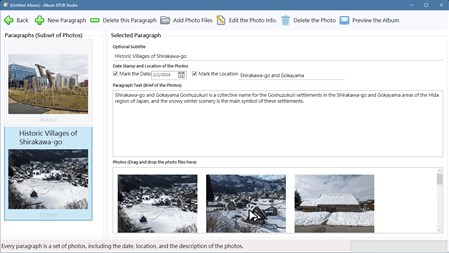 The software provides a way similar to posting a message on a social web site. It makes the establishment of EPUB files simple for everyone. By the user-interface of the software, the user creates a new album, creates a new chapter, than creates a new paragraph. In the new paragraph, the user fills a description, picks the photo date and location, and drags some photo files into the software. Repeating the steps, the album is completed, and can be exported to an .album.epub file. Also, the software can export an album into a zipped website file if you want to share it over internet.