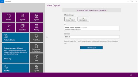 Features • Deposit checks with Ally eCheck Deposit℠ • Transfer money between your Ally Bank accounts and accounts at other banks • Pay bills, see scheduled payments and review payment history • Check balances and search transaction history • Use Zelle® to pay almost anyone with a bank account in the U.S. • Find nearby ATMs