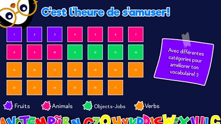 Peu importe ton âge, ce jeu te permettra d'apprendre l'anglais en t'amusant tant au niveau écrit que parler. Écoute moi prononcer chacun des mots et ensuite associe le bon mot à la bonne image. Commençons par les fruits, les animaux, les objets et ensuite nous aborderons des sujets plus avancés comme les verbes d'action.