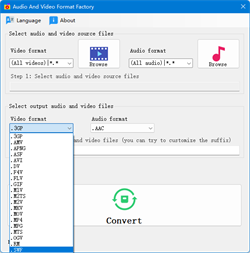 Convert to the following video formats: 3GP, AMV, APNG, ASF, AVI, DV, F4V, FLV, GIF, M1V, M2V, M2TS, MKV, MOV, MP3, MP4, MPG, MTS, OGV, RM, SWF, WAV, WEBM, WMV, SWF, XVID