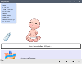 Karma represents your overall game progress and player experience. The baby can grow after 100 days of age (after acquiring clothes and shoes). The baby will respond with sounds on tap on the Main screen. It is possible to change sound settings on the Account screen.