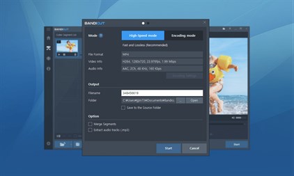 Bandicut supports two cutting methods, [High-Speed mode] and [Encoding mode]. "High-speed mode" allows the user to cut a video precisely without re-encoding, as a result the quality is lossless and the cutting speed is faster than any other software. "Encoding mode" allows re-encoding if the user wishes to change the codec, resolution or quality of a video according to their needs.