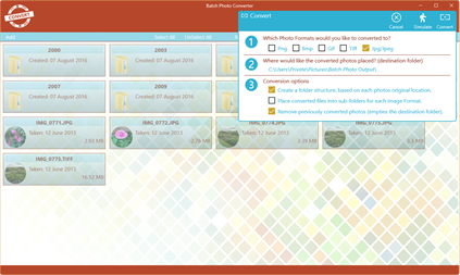 Batch Photo Converter is secure by default, it will never overwrite your original photos. It creates converted copies, while optionally replicating folder and file names. This flexibility enables you to merge everything into one consolidated archive, or just a few photos for a project into a single folder.