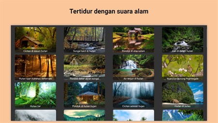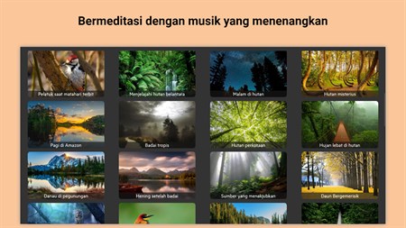 - Kicau di hutan - Sungai di hutan - Bermalam di kolam - Sungai kecil di hutan - Hutan saat matahari terbenam - Gubuk dekat sungai - Air terjun di hutan - Burung bulbul bernyanyi - Hutan liar - Bermalam di hutan hujan - Kicau setelah hujan - Hutan di pulau - Tidur di hutan pinus - Esensi dari alam liar - Hutan palem tropis - Keajaiban Hutan - Pelatuk saat matahari terbit - Menjelajahi hutan - Malam di hutan - Hutan Misterius - Fajar di Amazon - Badai tropis - Hutan Kota - Hujan deras di hutan - Danau Gunung - Tenang setelah badai - Sumber Terpesona - Gemerisik Daun - Burung Hantu Hutan - Burung Hutan - Kabin Di Hutan - Berjalan Melalui Hutan - Kabin Badai - Bebek di Kolam - Burung Mencicit - Paduan Suara Kriket yang Santai - Lebah Tanpa Tujuan - Ular Berbisa yang Tak Ada habisnya - Suara Sungai - Nyanyian Burung Mengejek - Burung Kolibri - Serangga di Teluk - Nyanyian Burung yang Bahagia - Angin Ringan Lembut