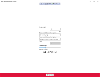 Target calorie consumption, time of exercise. Based on either of them, This software will propose some optimal exercise. Calculate BMI from height and weight. Calculate the target weight (back calculation) from height and target BMI.