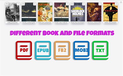 Supported different book and file formats: PDF, EPUB, FB2, MOBI, TXT and other.