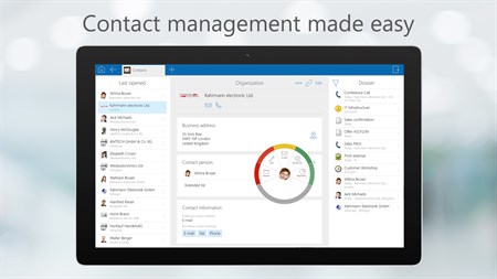 Contacts Stay connected anytime – call, write or text your customers or business partners directly from within the app. Different contact lists help you to structure your contacts, so that you can display all of your key account customers or your colleagues. Find your contacts easily with the smart search function.