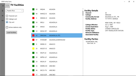 The CDBS Facility Query is a tool for querying the FCC's Commercial Database System (CDBS), a system used by broadcasters to submit filings. The files from this database are public and were processed into a database embedded within the app. This app allows viewing AM, FM, or TV facilities by state with sorting by frequency/channel, city, or callsign. Toggling between active and all facilities (off-air, cancelled license, etc.) is available as well. Selecting a facility then displays details, such as the address information of the facility, network affiliates, parties associated with the facility, etc.