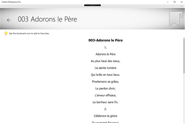 Chants D'Esperance Pro provides you access to all the lyrics of the song book Chants D'Esperance, and more. Some Tunes are also included with the Lyrics so you can learn and help you worship. As new books, lyrics or tunes become available, you can update the App catalog. This App does include Ads. Other Features include: + Add to Favorites, You can create your own favorite list of songs/lyrics. + Send or share Lyrics via Emails + Listen to the Tune of some Lyrics... +Easy to use and Optimized for Smartphones and Tablet