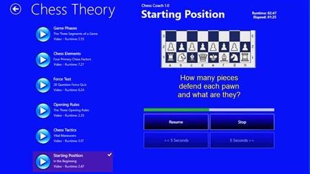 Chess Coach 1.0 stresses Chess Theory as a means of better understanding how to play the game. Knowing why you make each move during a game is critical to playing good Chess.