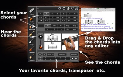 Try 1 day for FREE! Using this great chords collection, you will be able to play the chords of 7 popular music instruments (piano, guitar, bass guitar, ukulele etc.), no prior experience needed! The app contains all the necessary chords to play all your favorite songs! All music instruments in the app are interconnected, and this gives the unique ability to transfer the chords from one instrument to another! Take advantage of clear, easy-to-use interface and learn the basic and advanced chord charts. You can: - see the chords in notes representation, in keys representation, in standard string representation, in TAB-representation and as colored photos, - listen to the chords you selected with the original instrument sound of your choice, - drag and drop the chords into the GarageBand, - drag and drop pictures with chords to your documents, - create, save and load the chords of your favorite songs, - avoid the Mickey Mouse voice and transpose the chords to the key perfect for your voice range level.