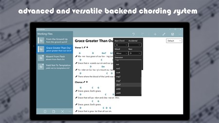 Chordwriter is a professional chord editing tool suitable for all your chording needs. The editor is simple, yet powerful, and uses a clean interface for the best possible editing experience. You will be amazed at its simplicity, and awed at its power. It integrates directly with the Leadsheet music system and Dropbox, giving you the ability to leverage your online trove of music with ease.