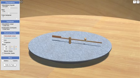 In it the user can manipulate the angular velocity of a graduated rod and the position of a sphere, which can slide over the rod. The simulator shows some information about the quantities related to the UCM in addition to the vectors associated with the vector quantities: speed and acceleration.