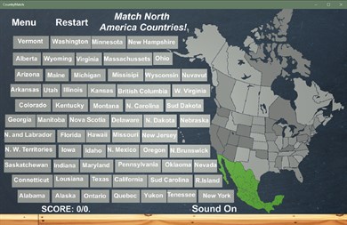 CountryMatchNA is an educational game that will test your geography skills. You will have to associate each state of North American with its position on the map . First you have to click on the name of the country and then on the position on the map. If the match is right you gain a point. If it is wrong you gain an error. When you have clear the stage, you can see your score and the teacher comment. Try to guess the position of all the countries of North America and check out your knowledge of political geography.